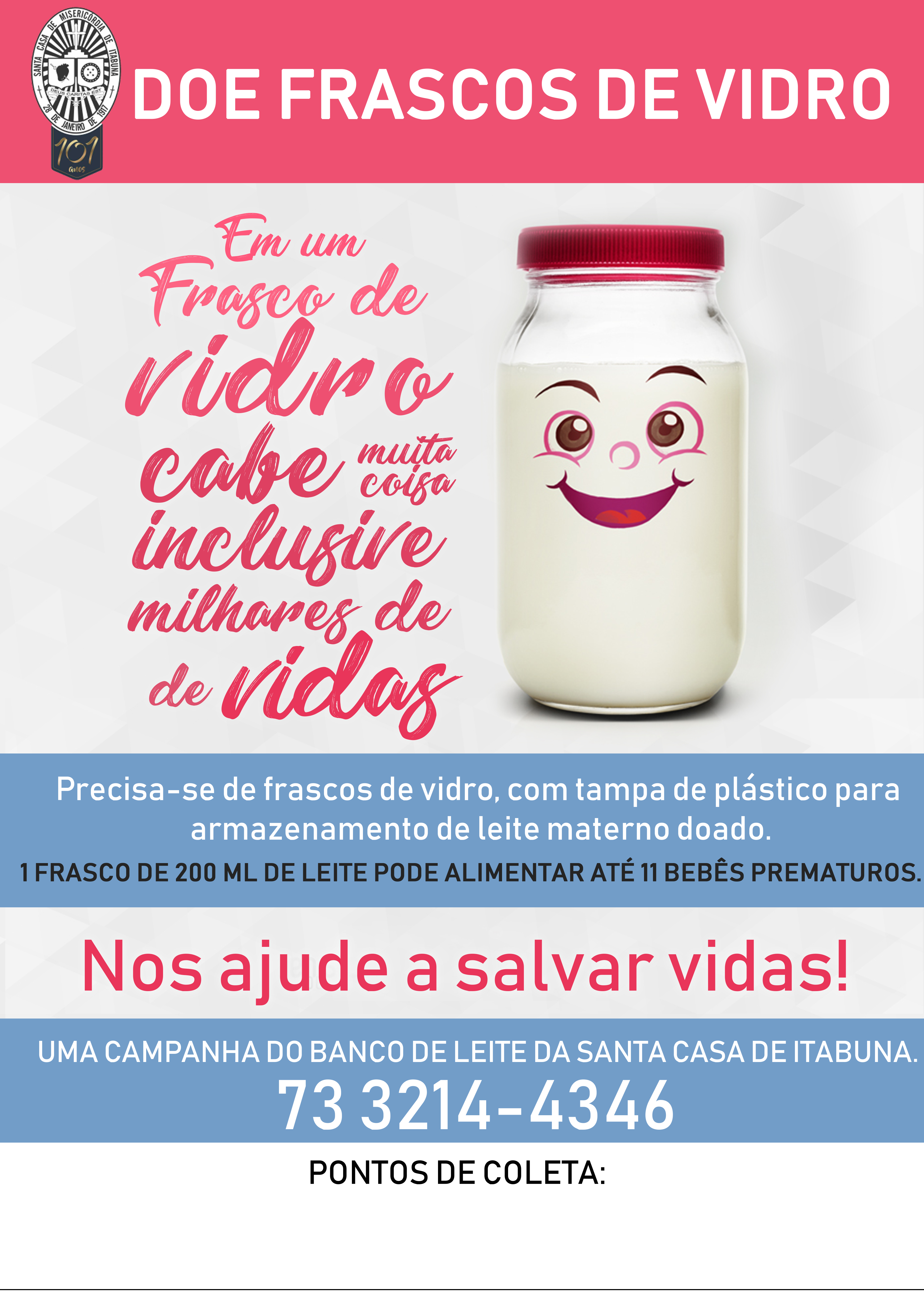 Com a reativação do projeto Amigos do Peito em maio deste ano pelo Banco de Leite da Santa Casa de Itabuna, o número de mães doadoras aumentou e consequente a demanda por potes para armazenamento do leite materno, por este motivo, o Banco de Leite da SCMI lançou nesta quarta feira (04) a campanha “Em um pote de vidro cabe muitas coisas, inclusive vidas”. Objetivando arrecadar potes de vidro com tampas de plástico para o armazenamento de leite materno doado.