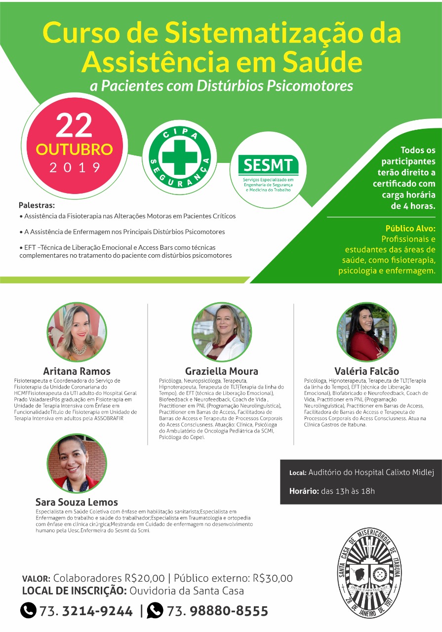 Voltado para profissionais e estudantes das áreas de saúde, como fisioterapia, psicologia e enfermagem, o curso vai acontecer no Auditório do Hospital Calixto Midlej Filho das 13h às 18 h, onde serão ministradas três palestras: “Assistência da Fisioterapia nas Alterações Motoras em Pacientes Críticos”, com a fisioterapeuta Aritana Ramos; “A Assistência de Enfermagem nos Principais Distúrbios Psicomotores” com a enfermeira do trabalho, Sara Lemos e “EFT –Técnica de Liberação Emocional e Access Bars como técnicas complementares no tratamento do paciente com distúrbios psicomotores” comas psicólogas, Graziella Moura e Valéria Falcão.