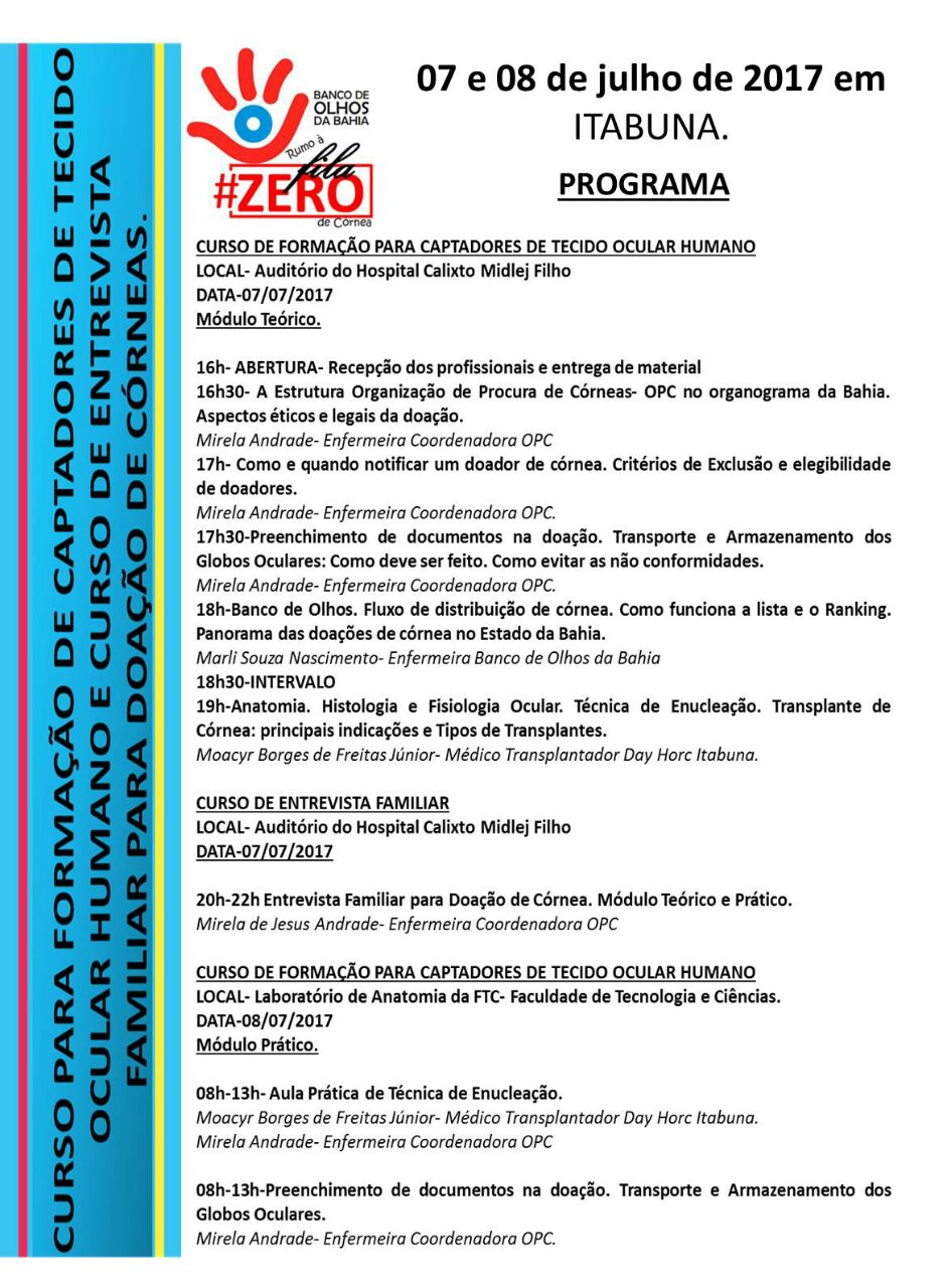 A capacitação é inédita na região Sul da Bahia e tem como objetivo central formar profissionais na área de saúde para atuar como captadores de córneas. O curso tem como público alvo profissionais da enfermagem, assistentes sociais, e outros interessados. Na programação, aspectos éticos e legais da doação de córnea; critérios de exclusão e inclusão de doadores; como e quando notificar; preenchimento de documentos; funcionamento do Banco de Olhos da Bahia. Haverá ainda a abordagem de temas técnicos como anatomia e fisiologia ocular; técnica de enucleação; transporte e armazenamento dos globos oculares. As vagas são limitadas e as inscrições gratuitas devem ser feitas pelo e-mail txenfermagemscmi@gmail.com