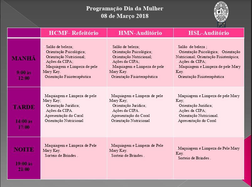 Sobre a programação, a atividade contará com salão de beleza parceiros levando serviços de auto-estima para as mulheres; além de limpeza de pele e maquiagem. As funcionárias dos três hospitais contarão com Orientação Nutricional e de Fisioterapia, stand com abordagem Psicológica sobre Empoderamento da mulher e orientações jurídicas.