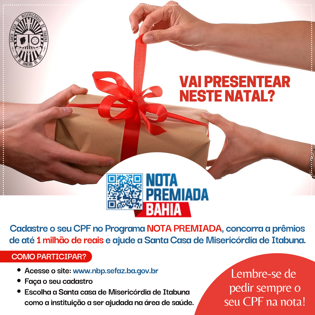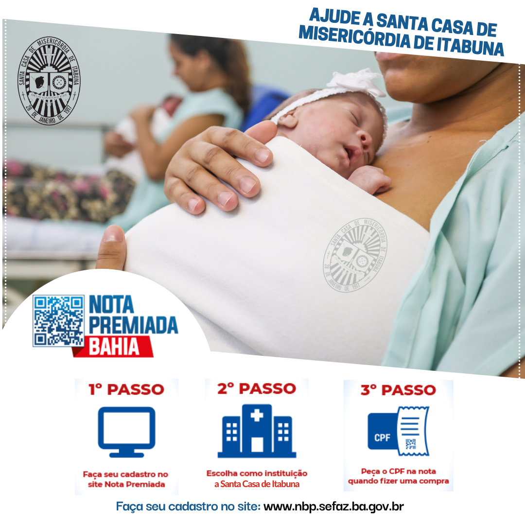 Que tal ajudar uma instituição filantrópica que tem cerca de 70% dos serviços ofertados aos usuários do Sistema Único de Saúde (SUS) e ainda concorrer a sorteios mensais de até R$ 1 milhão? Você pode fazer isso sem ter de desembolsar qualquer quantia, precisando somente se cadastrar na Campanha Nota Premiada Bahia e indicar, como ato de solidariedade, a Santa Casa de Misericórdia de Itabuna como instituição na área de saúde.