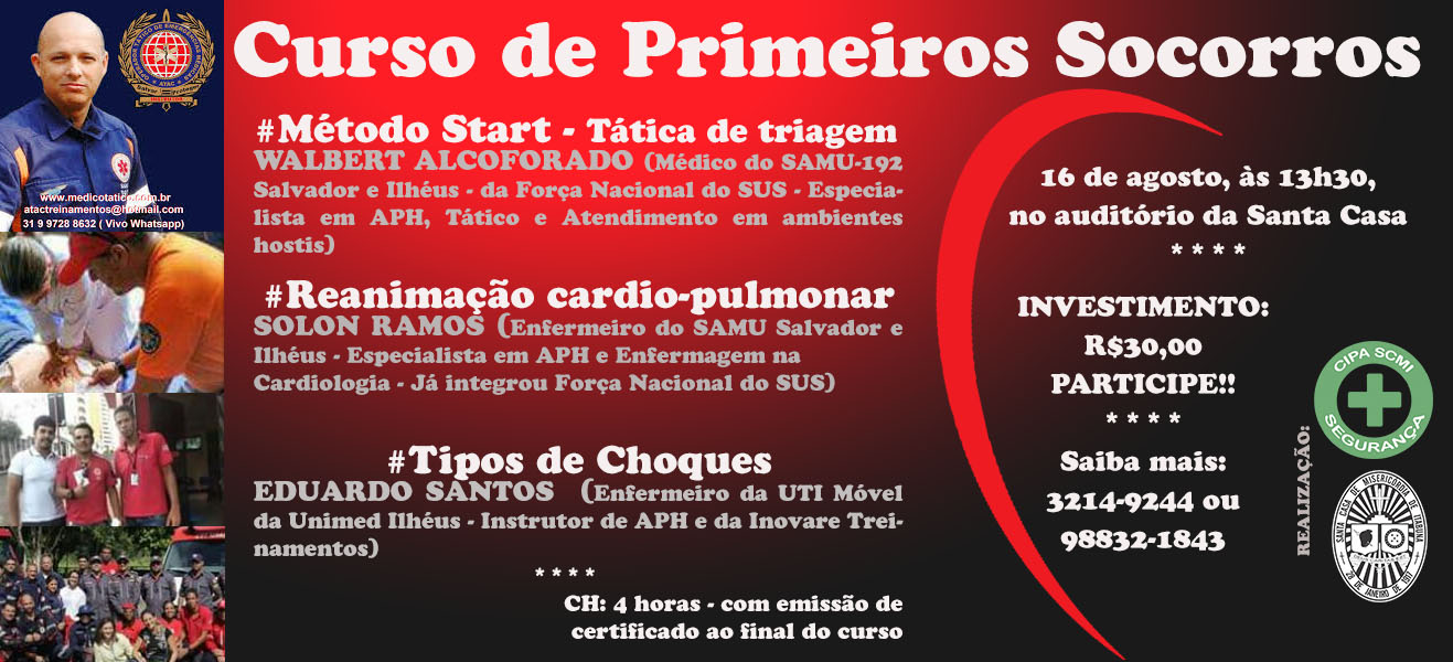 O auditório da Santa Casa de Misericórdia de Itabuna recebe neste dia 16 de agosto mais um curso de atualização. O tema desta vez é Primeiro Socorros e a promoção é da CIPA do HCMF. A carga horária é de 4 h/a com emissão do certificado ao final do curso. Sobre os palestrantes convidados, o médico socorrista Walbert Alcoforado ministrará…