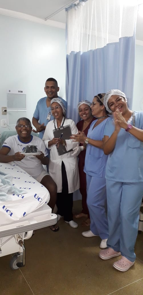 Foi o que aconteceu com o paciente Ederivaldo Benedito. Ele fez aniversário no dia 12/02, mas como passou por um procedimento no mesmo dia, foi surpreendido ontem (13) com a equipe da nutrição que chegou em seu quarto com um bolo e um cartão. A filha dele, Mariana Benedito, se emocionou com a atenção dada ao pai em uma data tão especial e até postou nas redes sociais, o seu agradecimento a toda equipe da instituição.”A todos que cuidaram e cuidam do meu pai durante esse susto – profissionais da UNICOR, da UCI, do Pavilhão João Otávio e demais colaboradores – minha mais pura GRATIDÃO!”, declarou.