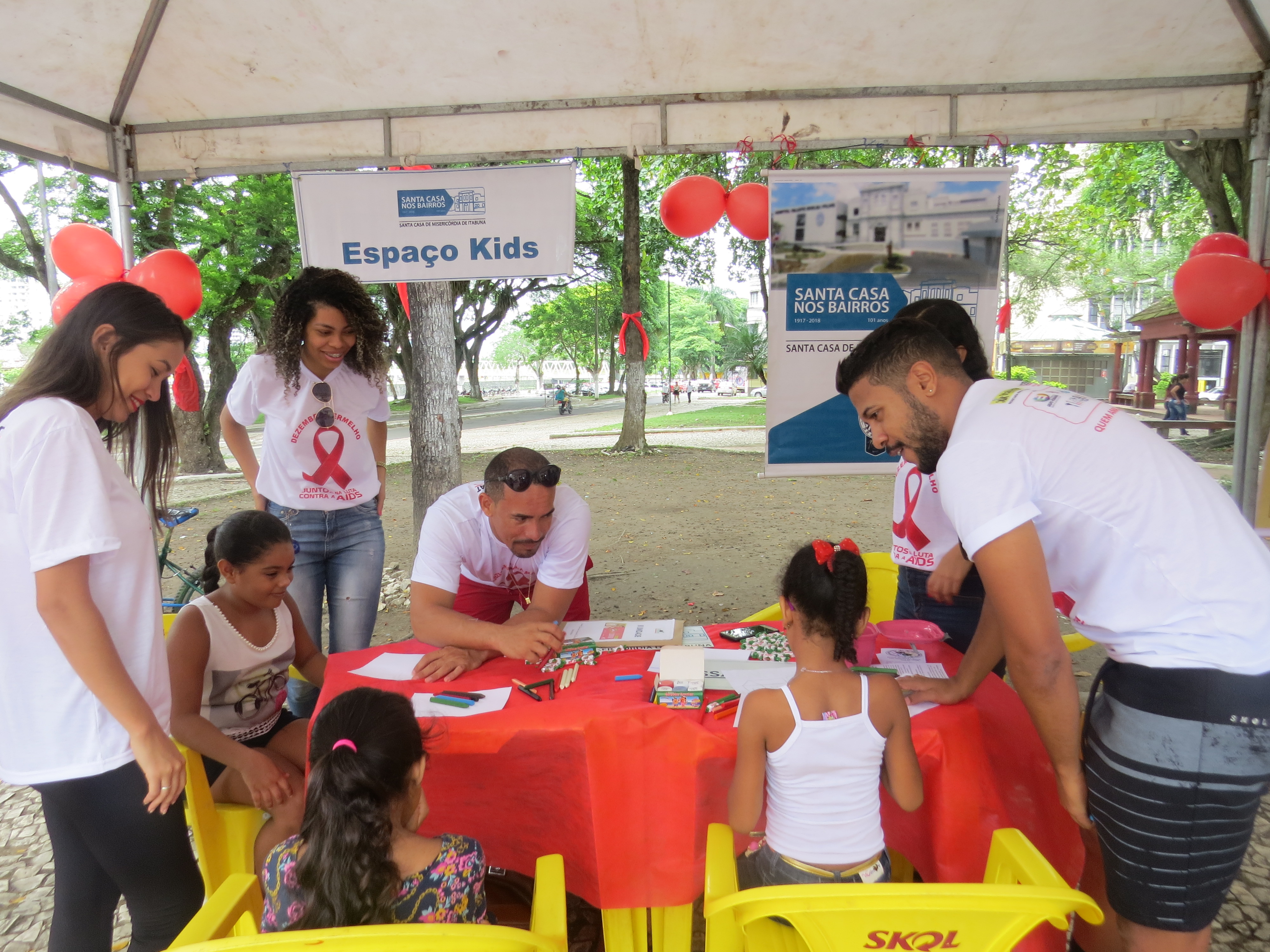 Brincadeiras e diversão marcam participação do Espaço Kids, do Projeto Santa Casa Nos Bairros, na Feira de Saúde, organizada pelo Centro de Referência em Prevenção, Assistência e Tratamento (CERPAT)- no dia D de Luta Contra a AIDS. O evento ocorreu sábado, 1º de dezembro, na Praça Olinto Leone.