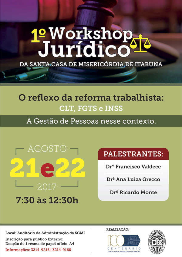 Com o tema O reflexo da reforma trabalhista no contrato de trabalho: CLT, FGTS e INSS – A Gestão de Pessoas neste contexto, o 1º Workshop Jurídico da Santa Casa de Misericórdia de Itabuna será realizado nos dias 21 e 22. O evento será realizado pelo corpo jurídico e terá carga horária de 5 horas.