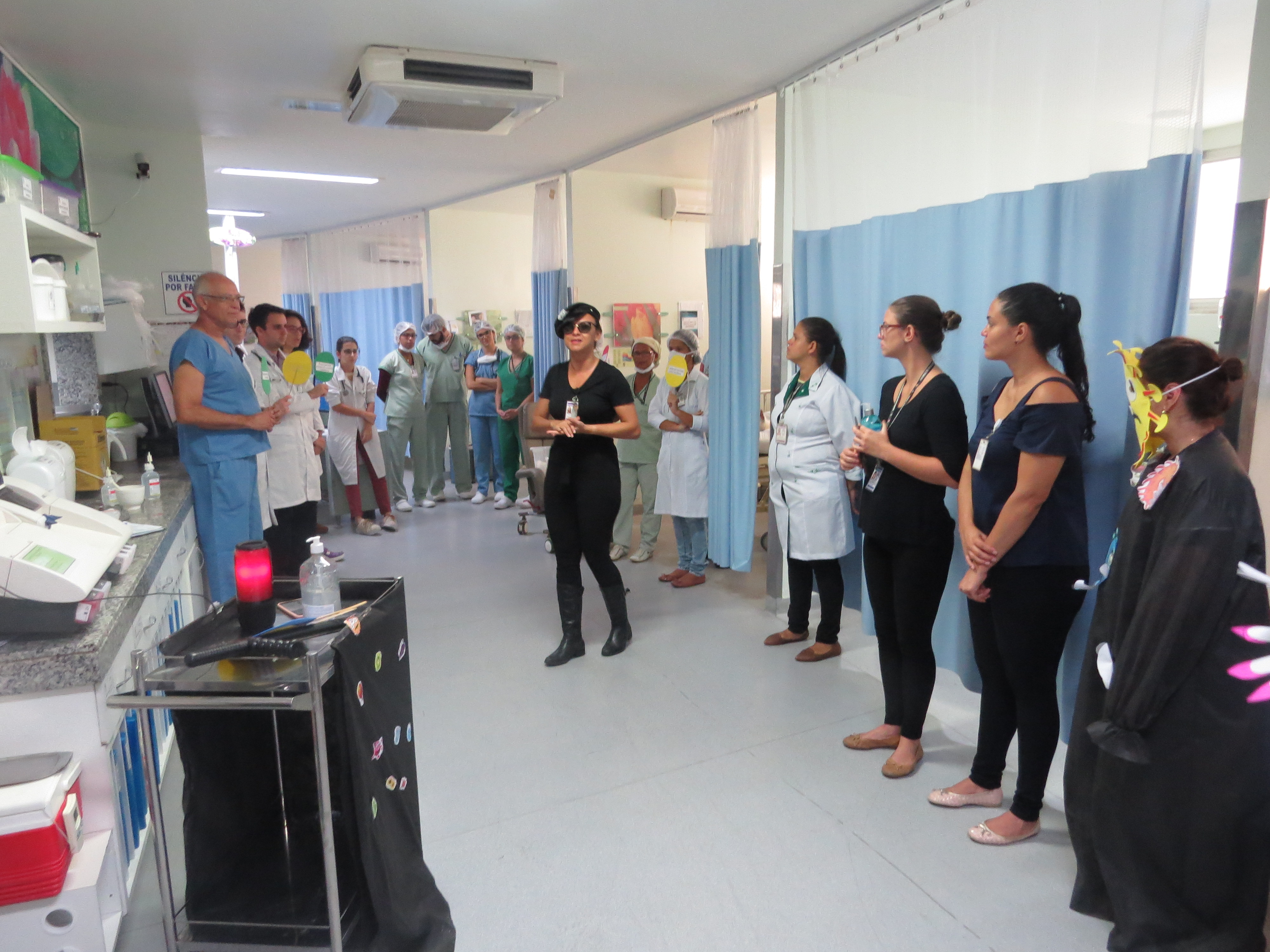 De forma lúdica, a equipe passou por todos os pavilhões do hospital fazendo uma representação teatral, que teve por objetivo de enfatizar a política de lavagem das mãos que está sendo disseminada na instituição.