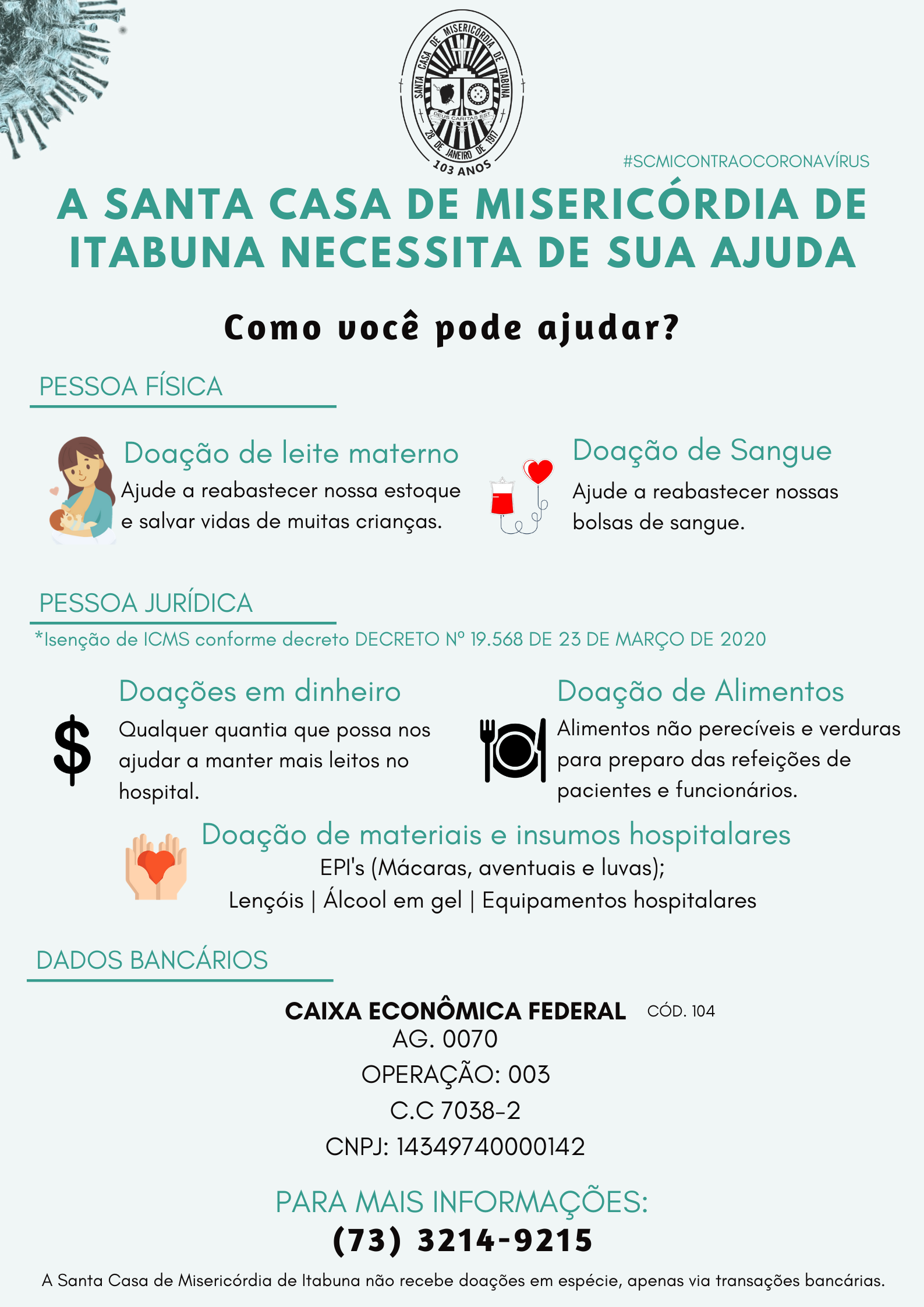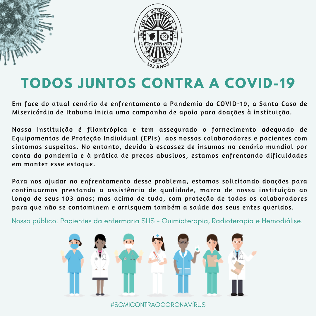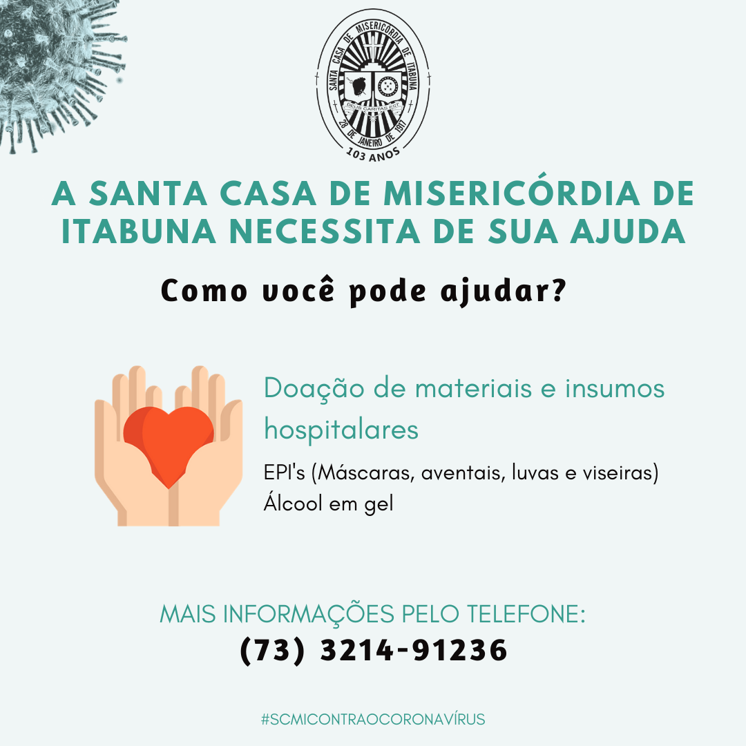 Neste contexto lançamos a Campanha intitulada “Todos Juntos Contra a Covid-19”. A ação que já conta com o apoio da Associação Comercial de Itabuna – ACI, Sindicato dos Comércio e Varejo – Sindicom e da Câmara de Dirigentes Lojistas – CDL, visa sensibilizar a população para a importância da doação de sangue e leite humano, que tiveram o fluxo diminuído com a pandemia, além da arrecadação de equipamentos e EPI’s necessários, alimentos não-perecíveis, materiais de limpeza, como também roupas de cama e toalhas de cor branca para compor os enxovais dos hospitais da Santa Casa que são referência no atendimento adulto e pediátrico de média e alta complexidade para mais de 120 municípios pactuados no sul da Bahia.