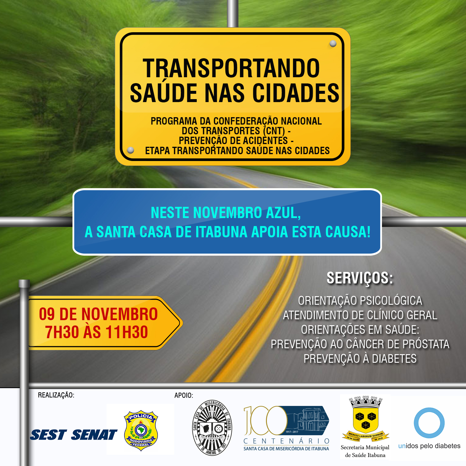 Neste Novembro Azul, a Santa Casa de Misericórdia de Itabuna trabalhará dois temas centrais de promoção à saúde: o combate ao Diabetes, em parceria com o Mutirão do Diabetes, e a Prevenção ao Câncer de Próstata, área de referência da instituição classificada como Unidade de Alta Complexidade em Oncologia (Unacon). A primeira ação da campanha será nesta quinta-feira (09), no Posto da Polícia Rodoviária Federal (BR 101, no Km 503 – Itabuna-Itajuípe), onde a Santa Casa participará do Programa de Prevenção da Acidentes CNT – SEST SENAT. A ação integra a etapa Transportando Saúde nas Cidades, executado pelo SEST-SENAT – Unidade Itabuna.