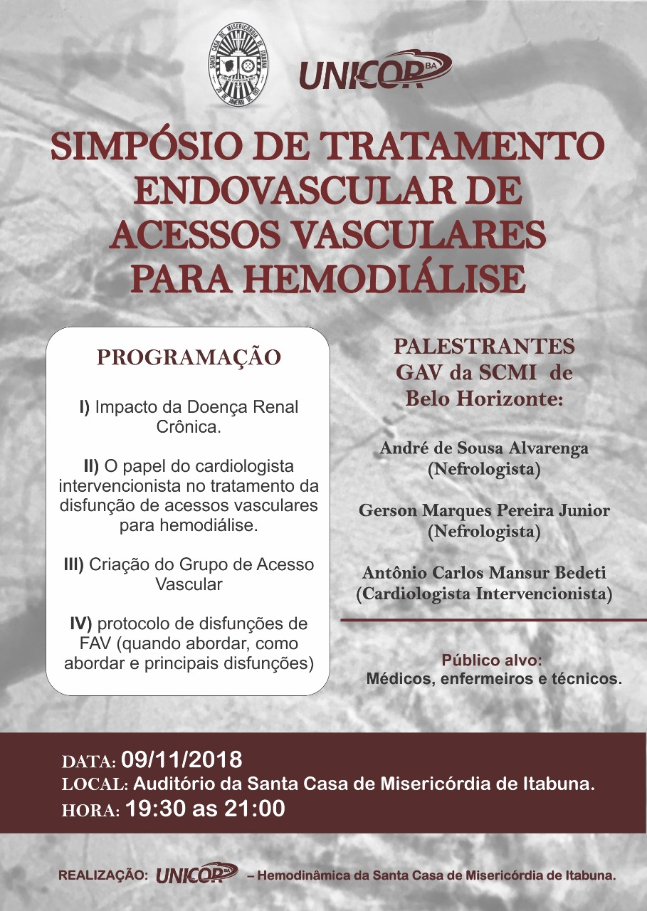 Com palestrantes da Santa Casa de Belo Horizonte, a Hemodinâmica da Santa Casa de Itabuna, realiza nesta sexta-feira (09), as 19:00h no auditório do Hospital Calixto Midlej Filho, o I Simpósio de Abordagem Endovascular de Fistulas para Hemodialise.